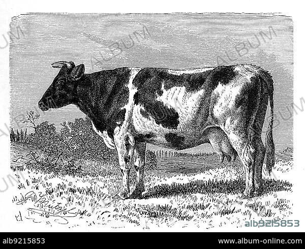 Dutch domestic cattle (Bos taurus), Holstein cattle hollandicus, The Holstein cattle breed is one of the most important dairy cattle breeds in the world, Historic, digitally restored reproduction from an 18th century original