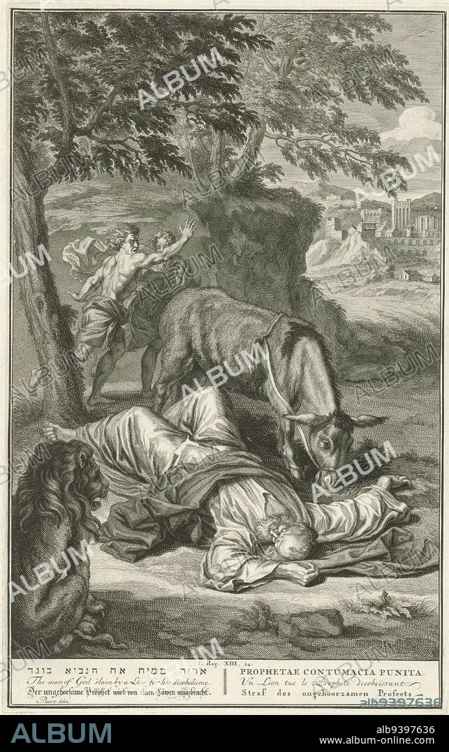 Caption: Punishment of the disobedient godman, Joseph Mulder, after Bernard Picart, 1720 - 1728, In a landscape lies the dead godman from Judah. Next to him are the lion and the donkey. The man of God had gone against God's instructions by eating and drinking in Betel anyway. When he left there on his donkey he was attacked by a lion and killed, but not devoured. Two passers-by are startled at the sight of the dead man. Below in the margin a reference to the Bible text and title in Hebrew, English, German, Latin, French and Dutch., print maker: Joseph Mulder, (mentioned on object), intermediary draughtsman: Bernard Picart, (mentioned on object), Amsterdam, 1720 - 1728, paper, engraving, etching, h 353 mm × w 222 mm