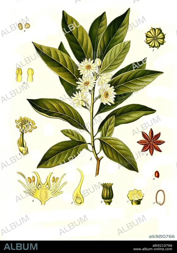 Caption: Medicinal plant, illicium anisatum (Illicium religiosum) or the shikimi fruit, Illicium anisatum and Illicium japonicum), Historical, digitally restored reproduction from a 19th century original