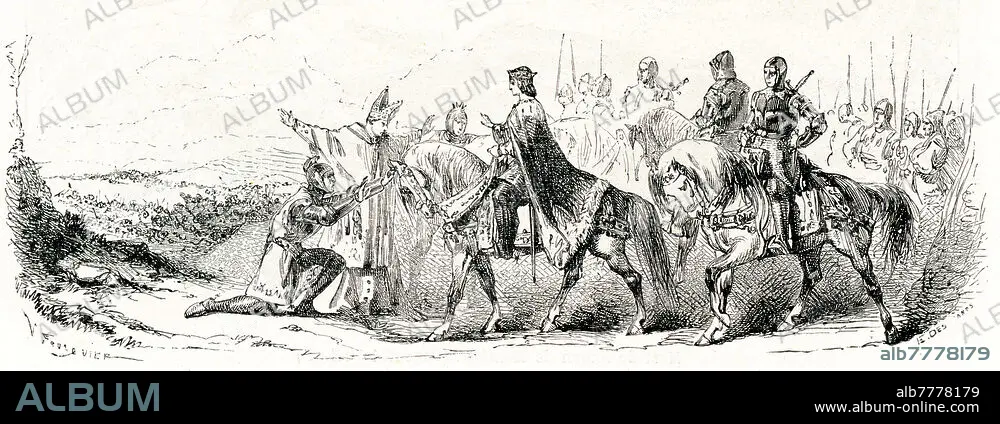 Crusade against the Albigensians (Cathars), the Archbishop of Auch and the Counts of Brittany and Saint-Pol beg Louis VIII to spare the prisoners / Engraving, 19th century