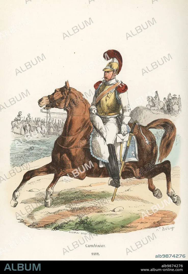 Caption: French Horse Carabinier carrying a letter, 1812. In brass helmet with crest or chenille, brass cuirass, white coat and breeches, red epaulettes, boots. Armed with straight sword. Mouton shabrack. 2nd Carabiniers regiment. Handcoloured woodcut by Andrew Best Leloir after an illustration by Hippolyte Bellangé from P.M. Laurent de lArdeches Histoire de Napoleon, Paris, 1840.
