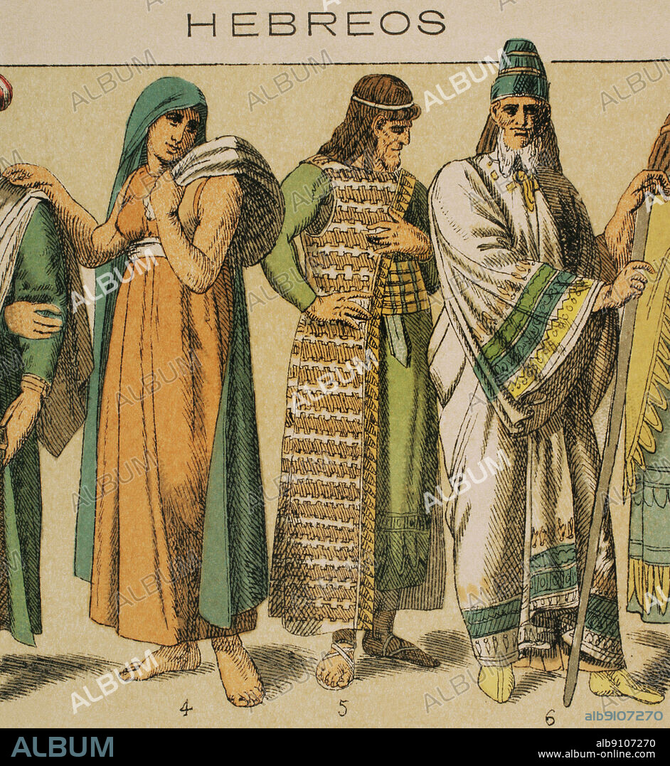 Hebreos. De izquierda a derecha, 4: traje de mujer del pueblo, 5: clase de manto, 6: traje persa-hebreo. Cromolitografía. Historia Universal, por César Cantú. Tomo I, 1881.