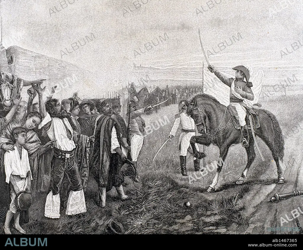 INDEPENDENCIA DE ARGENTINA. BELGRANO, Manuel (1770-1820). Militar argentino. "LA PRIMERA BANDERA ARGENTINA, PRESENTADA AL EJERCITO REVOLUCIONARIO POR EL GENERAL BELGRANO EL 27 DE FEBRERO DE 1812".