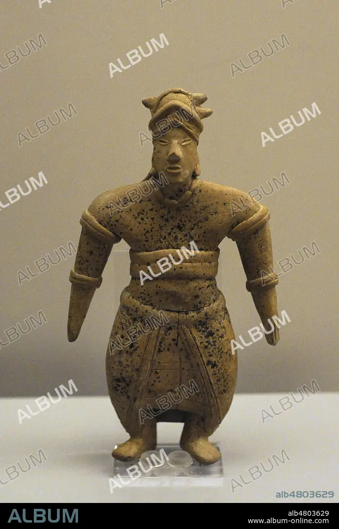 Descripción: Figura masculina de alto rango a tenor de su vestimenta y adornos. Cerámica. Estilo Colima (100-400 d. C.). Occidente de México. Museo de América. Madrid. España.