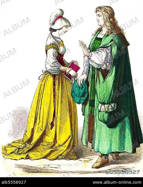 Munich Picture Gallery, Costumes, Early 16th century, German scholar, old man, young woman, elegant, robe, two persons, portrait, coloured historical illustration 1890