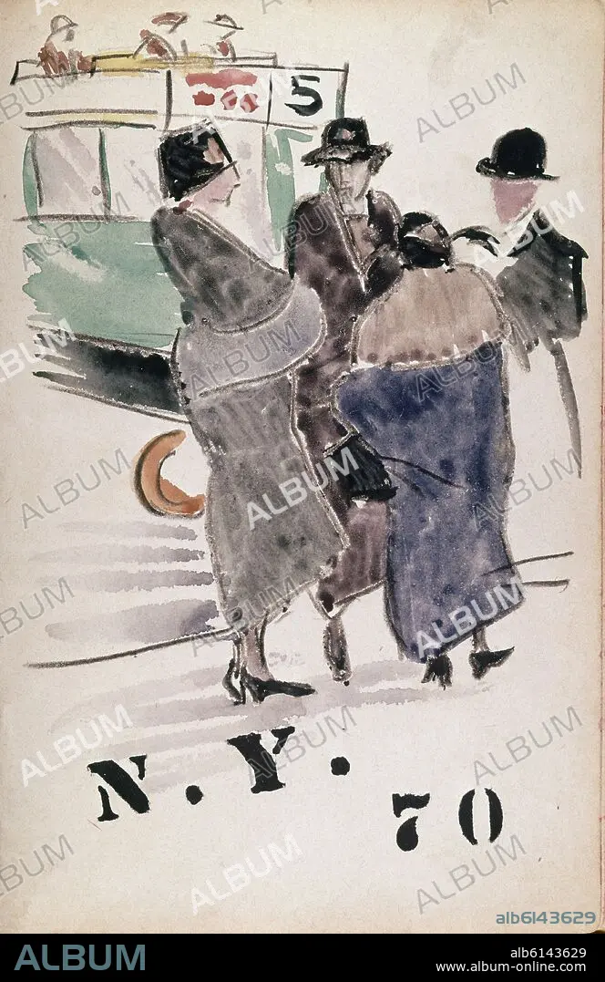 SERIE DIBUJOS DE NUEVA YORK AÑOS 20 - BURGUESES JUNTO A LA PARADA DEL AUTOBUS