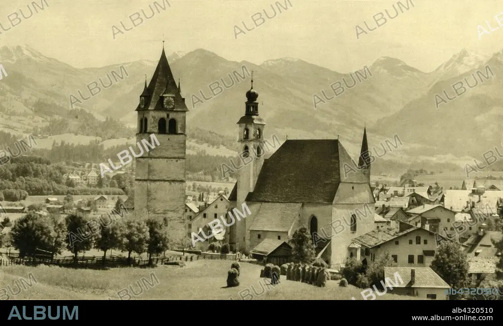 The Liebfrauenkirche and church of St Andreas, Kitzbühel, Tyrol, Austria, c1935. Medieval churches in the town of Kitzbühel: the 14th-century Liebfrauenkirche (Church of Our Lady) has a 16th-century bell tower. Zum heiligen Andreas (right), was built between 1435 and 1506 and has a shingle-covered roof. From "Österreich - Land Und Volk", (Austria, Land and People). [R. Lechner (Wilhelm Müller), Vienna, c1935]