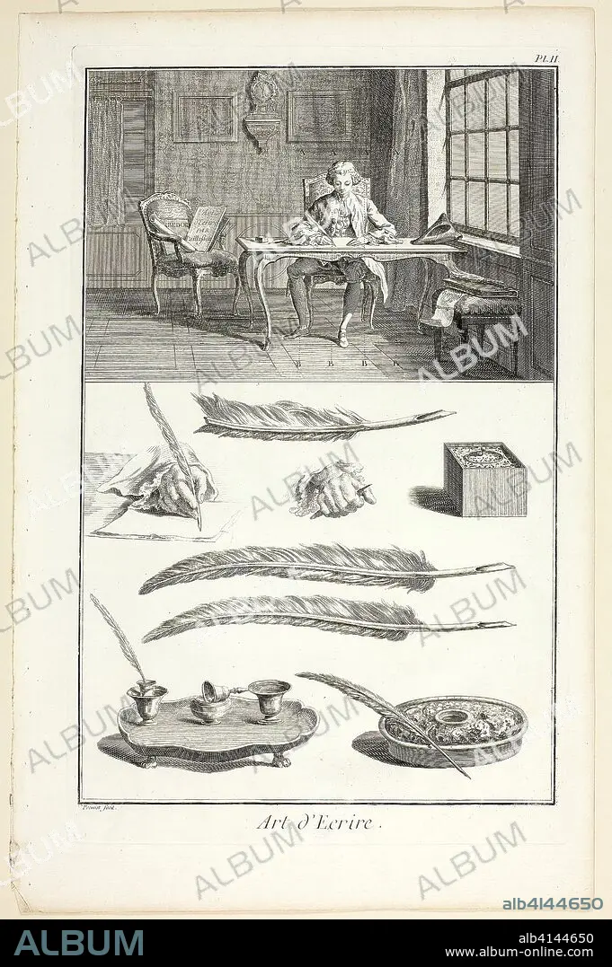 Art of Writing, from Encyclopédie. Benoît-Louis Prévost (French, c. 1735-1809); after Antoine-Gaspard Boucher d'Argis (French, 1708-1791); published by André le Breton (French, 1708-1779), Michel-Antoine David (French, c. 1707-1769), Laurent Durand (French, 1712-1763), and Antoine-Claude Briasson (French, 1700-1775). Date: 1760. Dimensions: 330 × 210 mm (image); 355 × 222 mm (plate); 400 × 260 mm (sheet). Engraving, with etching, on cream laid paper. Origin: France.