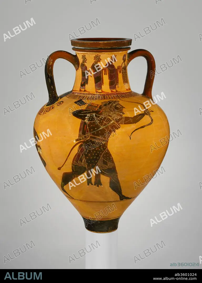 Terracotta neck-amphora (jar). Culture: Greek, Attic. Dimensions: H: 13" Greatest diameter: 8 3/4". Date: ca. 540-530 B.C..