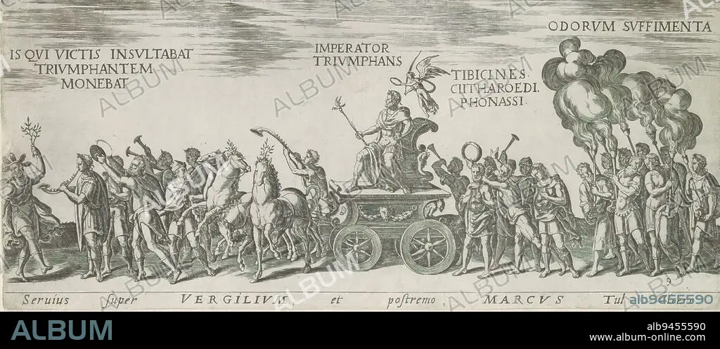 Triumph procession with the emperor on a triumphal chariot, Servius super Vergilium, et postremo, Marcus tul Cicero (title on object), Roman triumphs (series title), Amplissimi ornatißimiq triumphi, uti. L. PAVLVS DE rege Macedonum Perse capto, P. Africanus Aemilianus de Carthage: nensibus excisis. C N. Pompeius Magnus ex oriente, Julius Augus: tus, Vespasianus (...) (series title), Procession of musicians, priests with smoking incense and the emperor enthroned on a chariot pulled by horses. Title in Latin in lower margin. Print is part of an album., print maker: Onofrio Panvinio, after drawing by: Jan Snellinck (I), after design by: Maarten van Heemskerck, print maker: Italy, after drawing by: Antwerp, publisher: Rome, 1618, paper, engraving, height 156 mm × width 360 mm