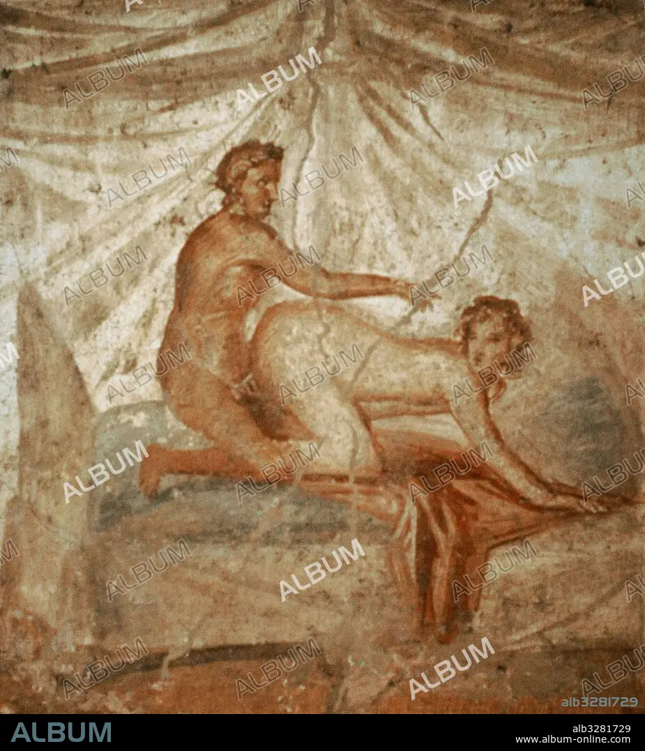 Fresco romano de temática erótica. Escena de sexo "more ferarum". Procedente de un edificio privado. Fechado hacia el 50-79 d-C. Pompeya. Gabinete Secreto. Museo Arqueológico Nacional. Nápoles. Italia.