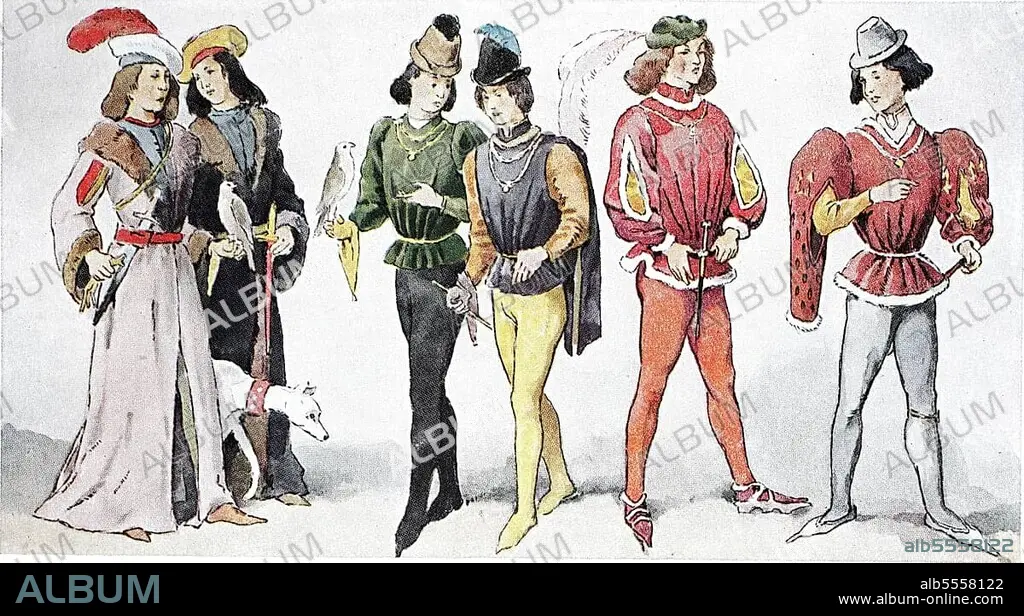 Kleidung, der ersten Hälfte des 15. Jahrhunderts, französische Gesellschaft, adlige Jugend der Falknerei, digital verbesserte Reproduktion eer Illustration aus dem 19. Jahrhundert, Mode in Frankreich