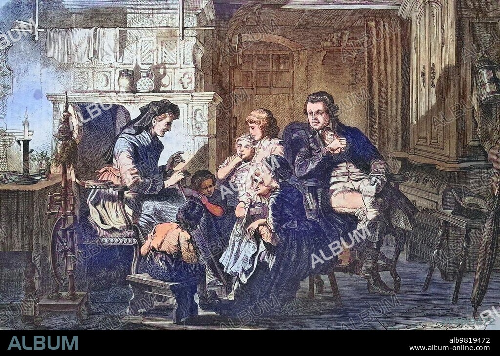 Musaeus collects fairy tales; Johann Karl August Musaeus; 1735; 1787; a German writer; literary critic; schoolman; philologist and collector of fairy tales and both a satirical and popular storyteller of the Enlightenment; historical engraving; 1869; Historical; digitally restored reproduction from a 19th century original; coloured; exact date unknown