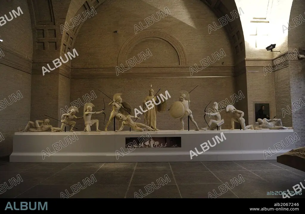 ARTE GRIEGO. GRECIA. Reconstrucción del grupo escultórico del frontón Oeste del Templo de Aegina. El original fechado hacia el 500 a. C. Guerreros troyanos y griegos junto a la diosa Atenea. Glyptothek. Munich. Alemania. Europa.