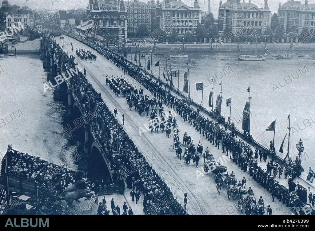 Coronation of King George V and Queen Mary, London, 1911. 'Second day, crossing the Westminster Bridge after visiting south London'. Crowds line the bridge, with flags and a grandstand (bottom left, by the statue of Boudicca), specially erected for the occasion. At top right is St Thomas' Hospital. The coronation of King George V of the United Kingdom (1865-1936) and Queen Mary of Teck (1867-1953) took place at Westminster Abbey in London on 22 June 1911. From "The Sphere", coronation edition, [June 1911]