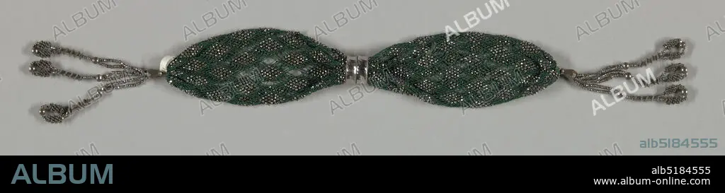 Miser's purse, Medium: silk, metal Technique: netting, Dark green silk net in which six threads cross each other at intervals forming diamond shapes, which are wholly covered by cut steel beads. Two steel rings control purse opening. Elaborate tassels at each end of cut steel bars, beads and twisted wire., France, 182040, costume & accessories, Miser's purse
