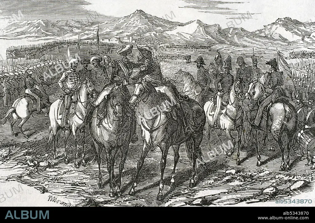 Rafael Maroto (1783-1847). Militar español. Se unió a las tropas del pretendiente Carlos I en la primera guerra carlista. Baldomero Espartero (1793-1879). Militar español, general en jefe del ejército isabelino. "Abrazo de Vergara" (31 de agosto de 1839) entre Maroto (bando carlista) y Espartero (bando isabelino). Ceremonia que puso fin a la Primera Guerra Carlista. Ilustración por Miranda. Grabado por Rico. Historia General de España por el Padre Mariana. Madrid, 1853.