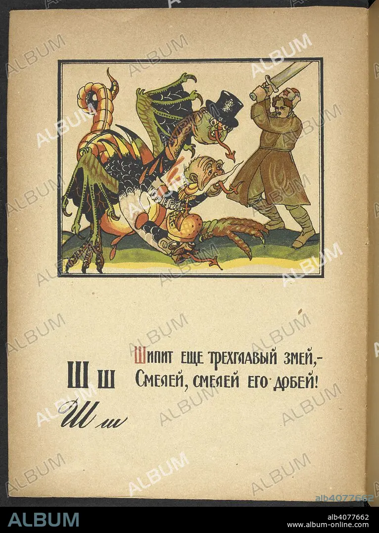 DMITRIĬ STAKHIEVICH MOOR. Шш Шипит еще трехглавый змей,- Смелей, смелей его добей! The three-headed snake still hisses,- Finish it off bravely! A Red Army soldier prepares to kill a three-headed snake depicted as a bourgeois, a White general and a clergyman. . Азбука красноармейца / Написал и нарисовал. [Moskva] : [Otdel voennoĭ lit-ry pri Revoli︠u︡t︠s︡ionnom sovete Respubliki]: [Gos. izd-vo], [1921] The department of war literature under the revolutionary military Soviet of the republic. State publishing house. Moscow. Source: Cup.401.g.25 no.12v. Language: Russian.