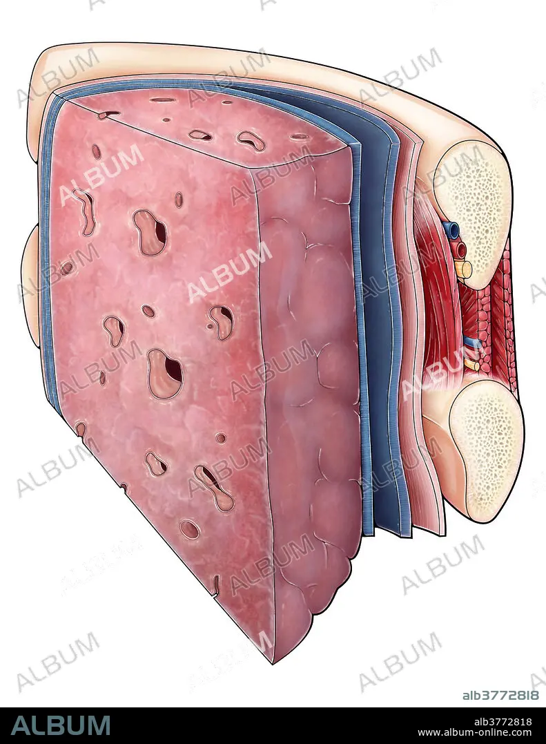 An illustrated section of a lung and the ribcage showcasing different layers of tissue and muscle. The pleura (blue) is a serous membrane covering the lungs (visceral pleura) and chest wall (parietal pleura), creating a fluid filled space (pleural cavity) which lubricates the lungs to aid in breathing. Between each rib are a series of intercostal muscles, arteries, veins and nerves. A layer of endothoracic fascia also lines the inner surface of the ribcage.