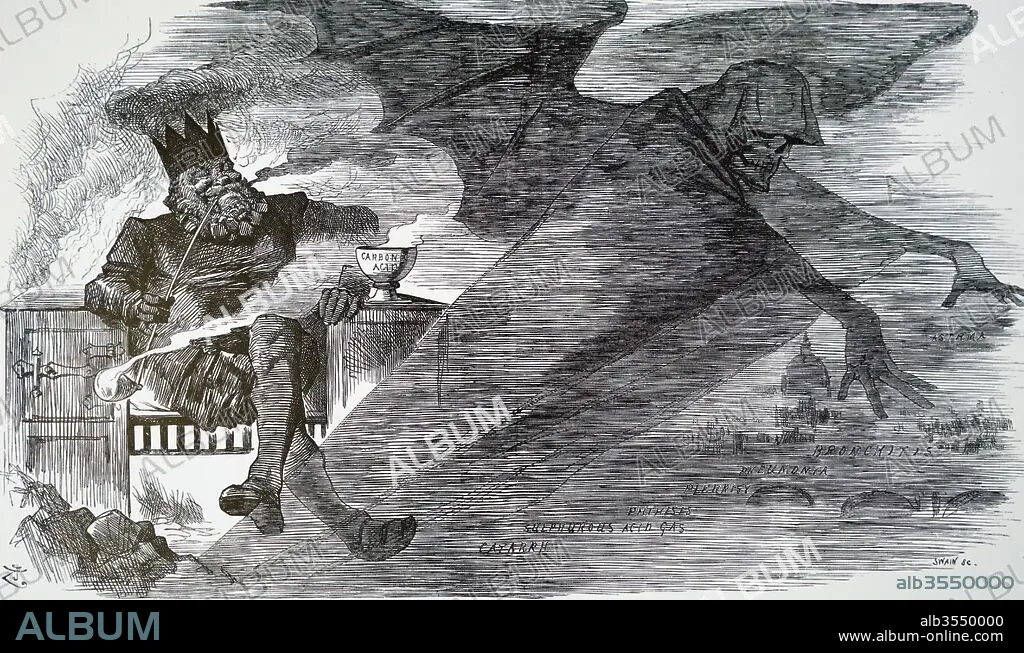 Cartoon depicting the effects of coal burning on London. 'Old King Coal' is shown using a typical kitchen range as an armchair, while the spectre of Fog hangs over the city suffering from its suffocating fumes. Illustrated by John Tenniel (1820-1914) an English illustrator graphic humourist, and political cartoonist. He was knighted for his artistic achievements in 1893. Dated 19th century.