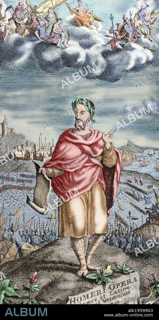 Descripción: HOMERO. Poeta griego, probablemente nacido en la Jonia minorasiática. Detalle del FRONTISPICIO Y PORTADA de las OBRAS COMPLETAS DE HOMERO. Tomo Primero "LA ILIADA", escrita en griego y en latín, concentra su interés en un episodio del año noveno de la GUERRA DE TROYA. Grabado coloreado. Edición de Amsterdam del año 1743.