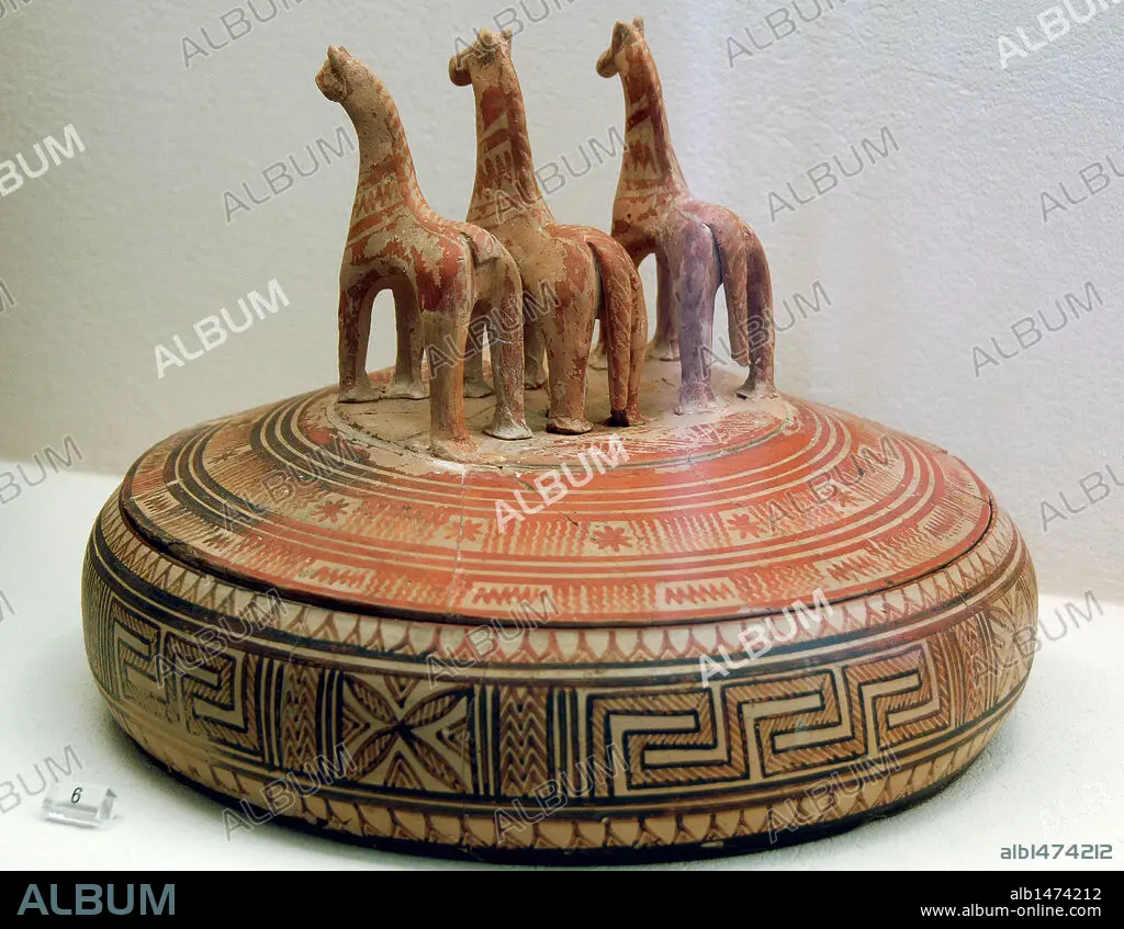 ARTE GRIEGO. PERIODO GEOMETRICO. GRECIA. PYXIS decorado con motivos geométricos y rematado con FIGURAS DE CABALLO en la tapa Museo del Cerámico. Atenas.