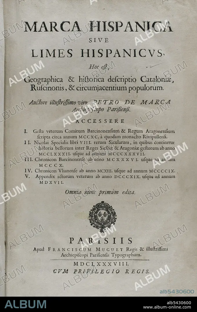 Descripción: "Marca Hispanica sive limes hispanicus". Obra escrita en latín por Pierre de Marca (1594-1662). En 1656 recibió el encargo de formalizar el tratado fronterizo entre los reinos de Francia y España, trabajos que quedaron reflejados en esta colección compuesta por cinco libros, dando a conocer al pueblo francés la provincia anexionada de Cataluña en 1641. Etienne Baluze la amplió y editó. Publicada en París por François Muguet en 1688. Biblioteca Histórico Militar de Barcelona. Cataluña. España.