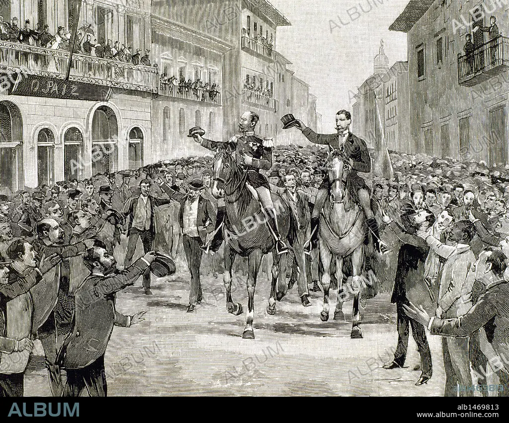 Brasil. Rio de Janeiro. Proclamación de la República de Brasil. Ovación del pueblo al general Deodoro da Fonseca y al ministro Quintino Bocaiuva, en la calle de Cuvidor. 15 de noviembre de 1889. Grabado, siglo XIX.