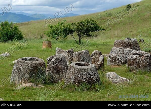 Archeology, large ancient stone jars in the landscape, Plain of Jars, Jar Site 1, Thong Hai Hin, at Phonsavan, Xieng Khouang province, Laos, Southeast Asia, Asia.