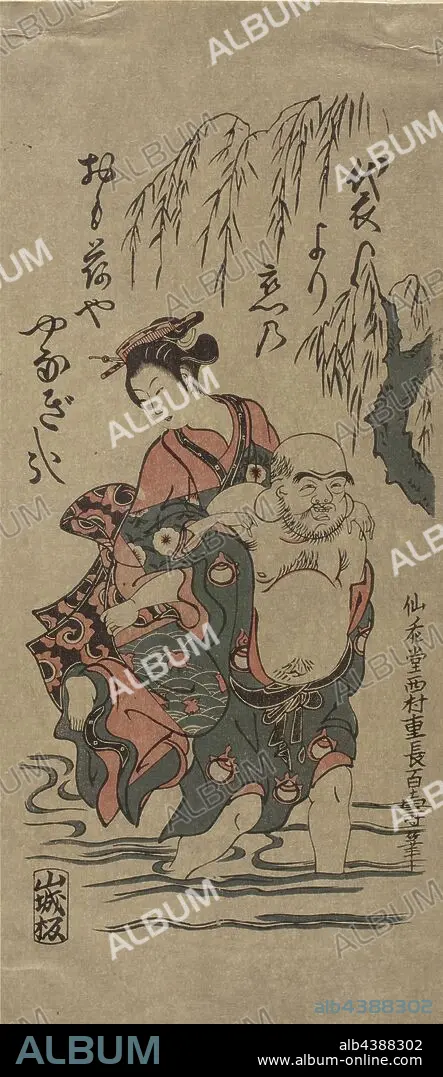 Hotei Carrying Young Girl Across Stream, Nishimura Shigenaga (Japanese, 1690-1758), 12-3/4 x 5-1/2 in. (image), Asian Art