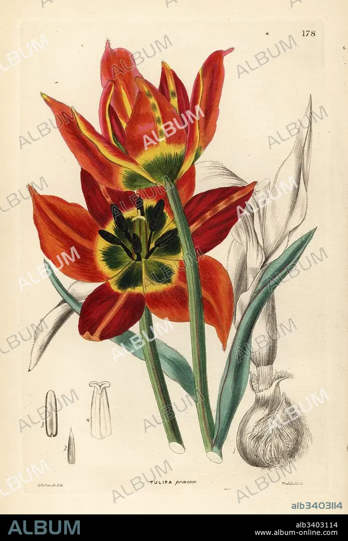 Tulipa agenensis (Early-flowered tulip, Tulipa praecox). Handcoloured copperplate engraving by Weddell after Edwin Dalton Smith from John Lindley and Robert Sweet's Ornamental Flower Garden and Shrubbery, G. Willis, London, 1854.