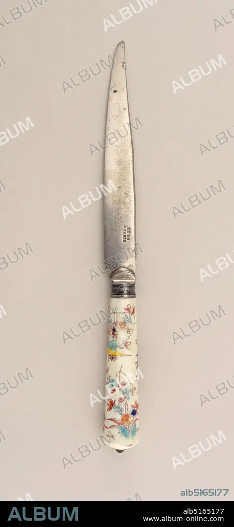 Knife with Floral Porcelain Handle, Chantilly Porcelain Manufactory, French, active ca. 1725 - ca. 1789, porcelain, vitreous enamel, steel, silver, Blade has slightly bent upper edge, lower edge tapering towards the point. Drop bolster, plain silver ferrule with horizontal band. Tapering, octagonal white porcelain handle decorated with kakiemon design in yellow, blue and green (underglaze) and brown-red (overglaze). Top of handle rounded, silver cap., France, 17251750, cutlery, Decorative Arts, knife, knife.