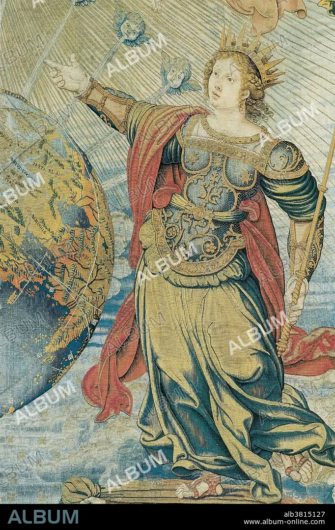 Juno, the warlike Roman goddess, as depicted in 'Earth under the Protection of Jupiter and Juno', c. 1520-30, a tapestry of gold, silver, silk and wool. From one of three extant panels of a series known as 'The Spheres'. The tapestries were woven for King John III of Portugal (born 1502, enthroned 1521, died 1557) and his wife, Catherine of Austria (born 1507, died 1578), a member of the Hapsburg family.