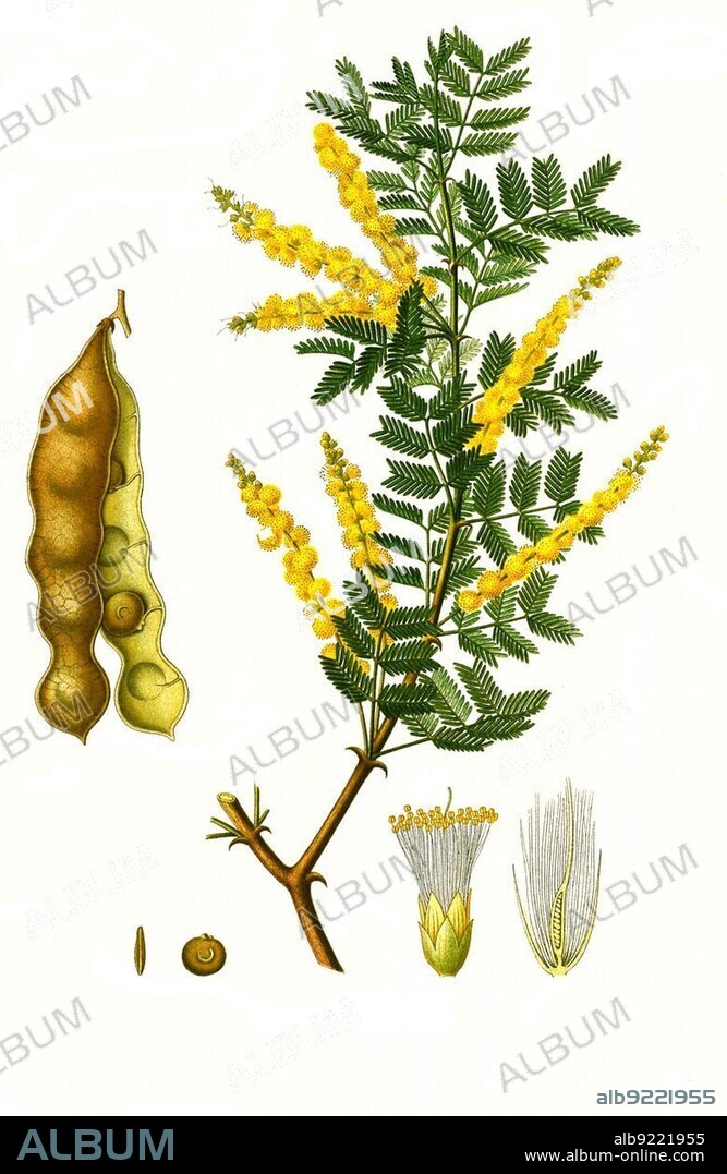 Medicinal plant, gum arabic tree Senegalia senegal, Acacia senegal, Senegal acacia, Verek acacia, is a species of plant in the genus Senegalia, Historic, digitally restored reproduction from a 19th century original