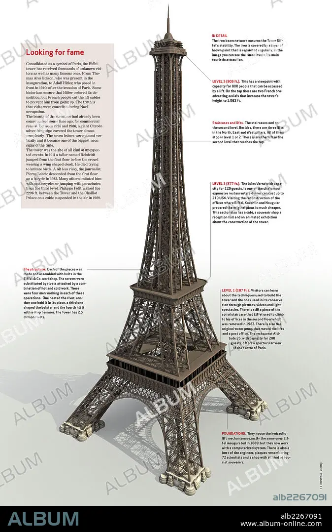 Infografía de las características principales e historia de la Torre Eiffel de París, construida en el año 1889.