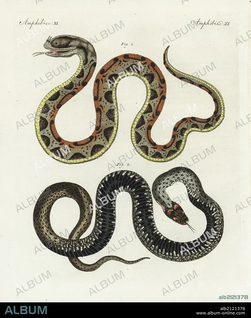 Rhinoceros viper, Bitis nasicornis 1, and carpet python, Morelia spilota 2. Handcoloured copperplate engraving from Bertuch's "Bilderbuch fur Kinder" (Picture Book for Children), Weimar, 1798. Friedrich Johann Bertuch (1747-1822) was a German publisher and man of arts most famous for his 12-volume encyclopedia for children illustrated with 1,200 engraved plates on natural history, science, costume, mythology, etc., published from 1790-1830.