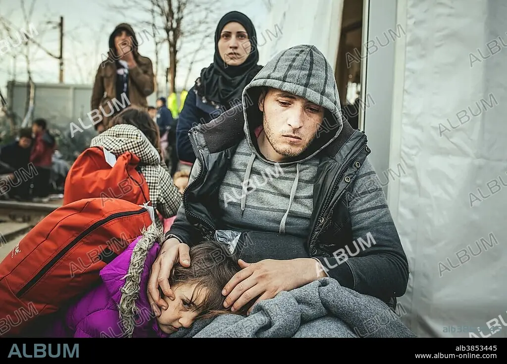 Idomeni refugee camp on the Greece Macedonia border, refugees waiting at a checkpoint, a disabled man with his family, who has been rejected from Macedonia, Idomeni, Central Macedonia, Greece, Europe.