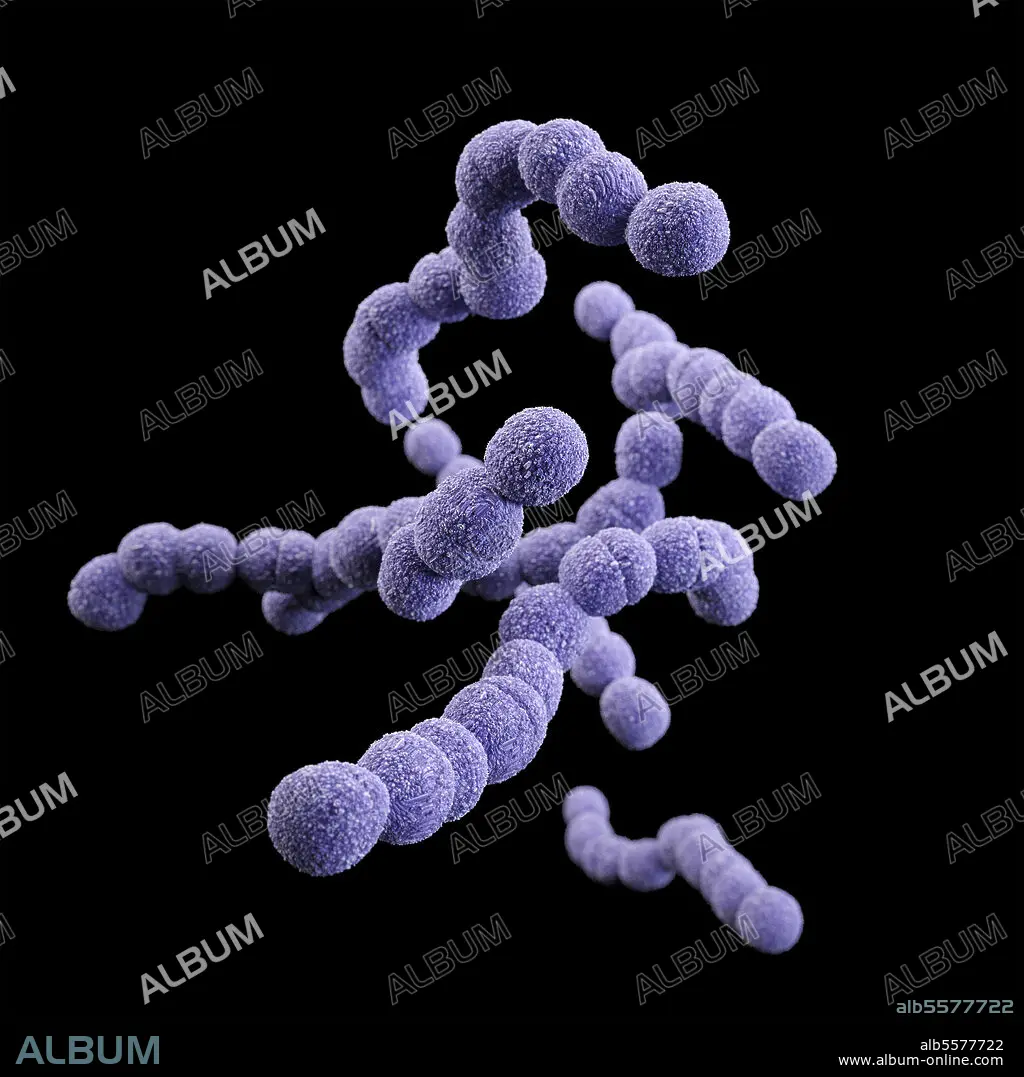 3D illustration of a group of gram-positive, Streptococcus agalactiae (group B Streptococcus) bacteria. This artistic recreation is based upon scanning electron microscopic (SEM) imagery.