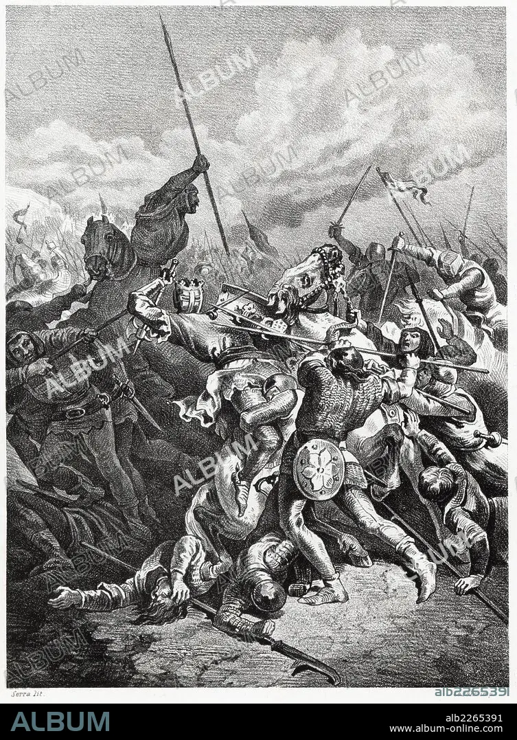Historia de España. Batalla de Muret el 12 de septiembre de 1213; la contienda enfrentó a Pedro II de Aragón contra las tropas de la cruzada albigense y las de Felipe II de Francia lideradas por Simón IV de Montfort. Grabado de 1872