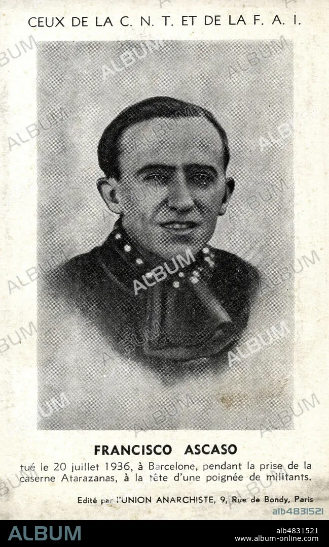 'Francisco ASCASO tue le 20 juillet 1936 a Barcelone pendant la prise de la caserne Atarazanas a la tete d'une poignee de militants'. Carte postale vers 1936 editee par l'Union Anarchiste. annees 30. Credit : IM/KHARBINE-TAPABOR.