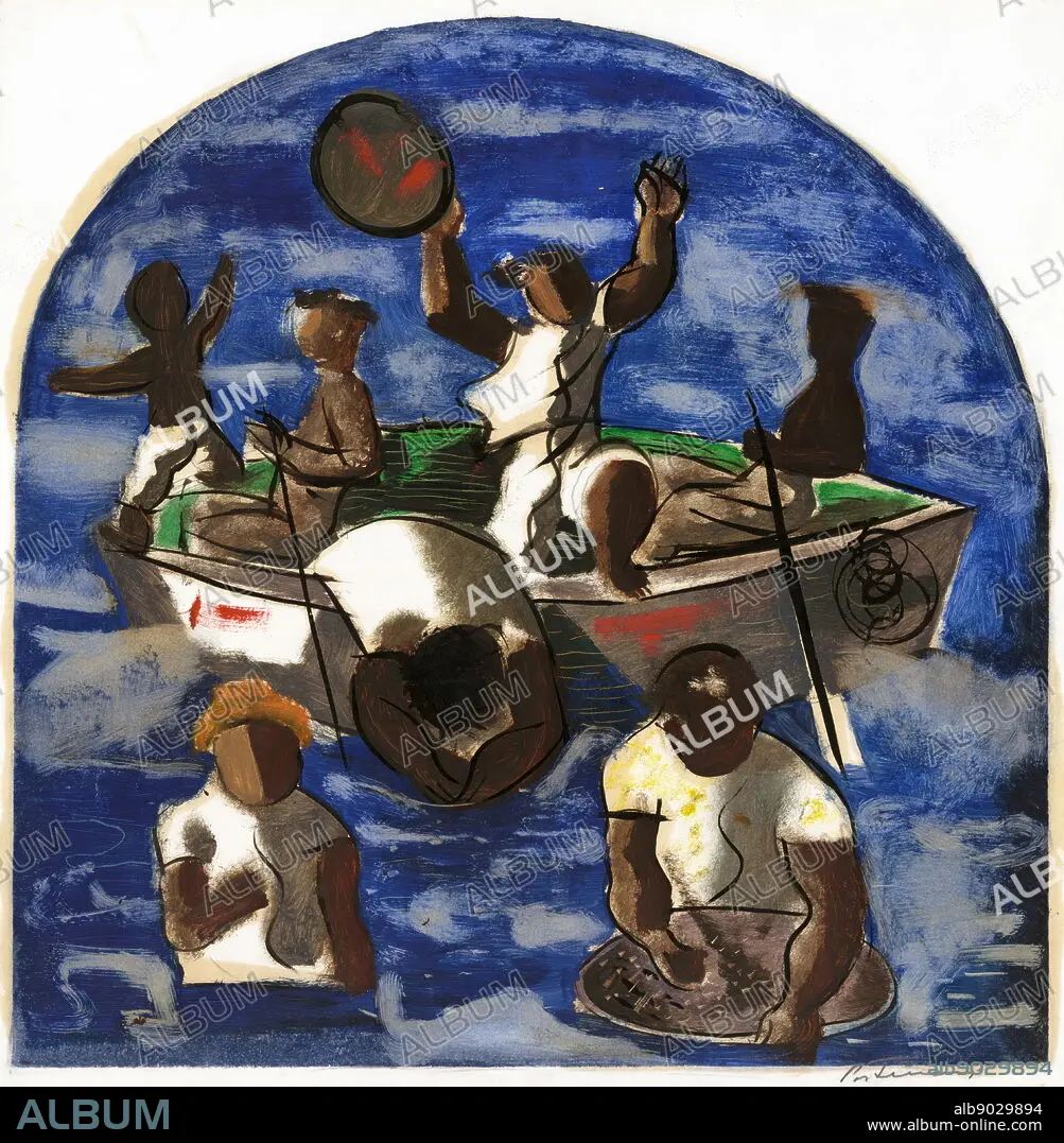 Preparatory drawing for 'Mining for Gold' mural at the Hispanic Division in the Library of Congress. Washington DC. By Cândido Portinari, 1903-1962, artist 1941. drawing in pastel, gouache and ink showing men panning for gold, two men in water and four others in rowboat
