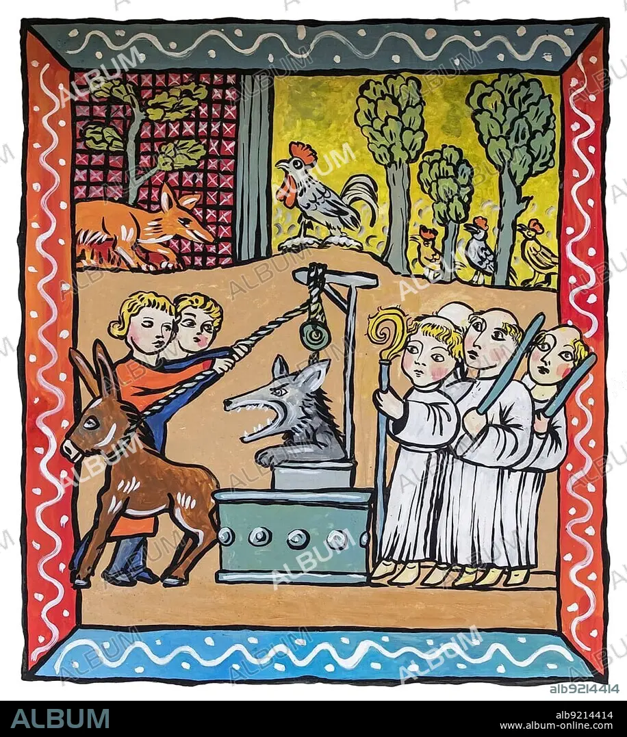 Medieval illustration of the Reynard the Fox fable showing the wolf Isengrim, Ysengrim in a water well