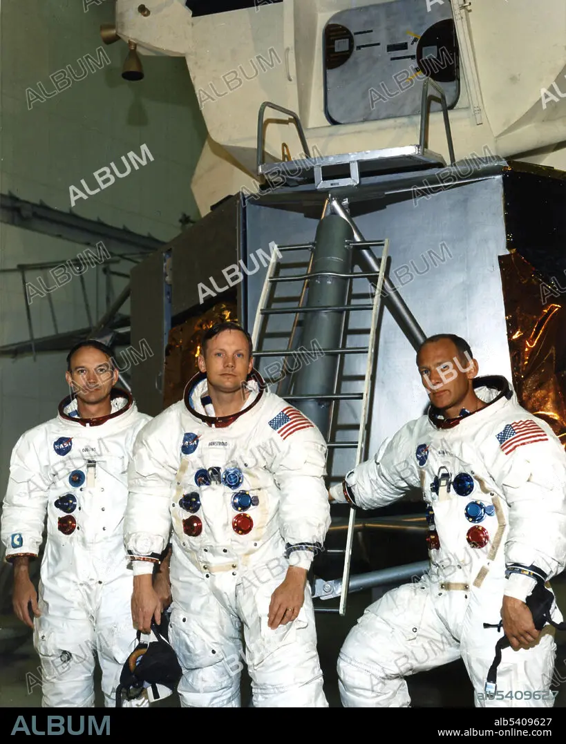 As the Apollo 11 astronauts rehearse their lunar landing mission in simulators, they pause in front of a lunar module mockup in the Flight Crew Training Building area. From left, are Command Module Pilot Michael Collins, Commander Neil A. Armstrong, and Lunar Module Pilot Edwin E. Aldrin, Jr. Apollo 11 was the spaceflight that landed the first two people on the Moon. Commander Neil Armstrong and lunar module pilot Buzz Aldrin landed the Apollo Lunar Module Eagle on July 20, 1969. Armstrong became the first person to step onto the lunar surface six hours later on July 21; Aldrin joined him 19 minutes later. They spent about two hours together outside the spacecraft, and collected 47.5 pounds of lunar material to bring back to Earth. Command module pilot Michael Collins flew the command module Columbia alone in lunar orbit while they were on the Moon's surface. Armstrong and Aldrin spent 21.5 hours on the lunar surface before rejoining Columbia in lunar orbit.