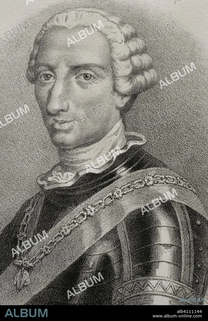 Carlos III de España (1716-1788). Rey de España desde 1759. Dibujo por J. Cebrián. Litografía. Retrato, detalle. Crónica General de España, Historia Ilustrada y Descriptiva de sus Provincias. Castilla-La Nueva, 1869. Biblioteca Histórico Militar de Barcelona, Cataluña, España.