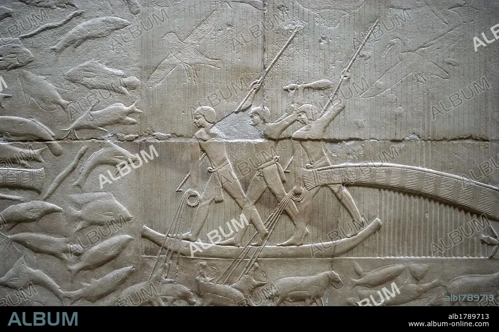 ARTE EGIPCIO. EGIPTO. MASTABA DE KAGEMNI o MENI. Tumba de un alto funcionario de la VI DINASTIA. IMPERIO ANTIGUO. Su interior se encuentra decorado con relieves menfitas. ESCENA PESCA. Necrópolis de Sakkara.