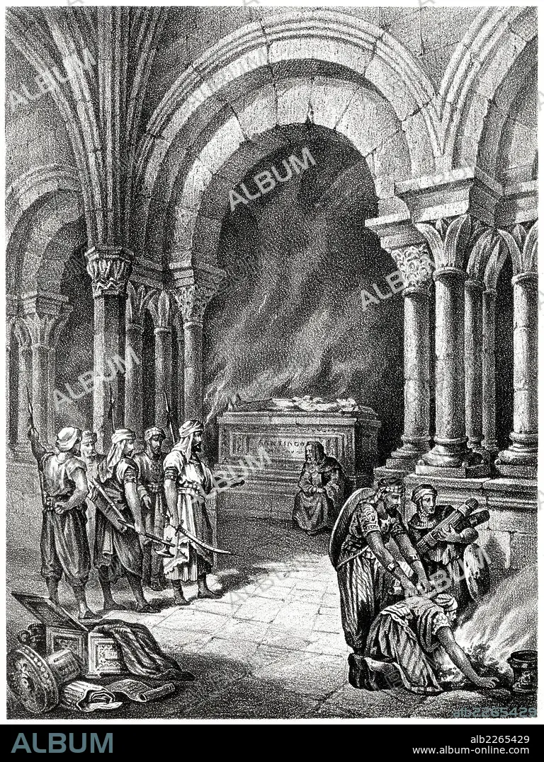 Historia de España. Almanzor ante el sepulcro del apóstol Santiago en Compostela, en el año 997. Grabado de 1872.