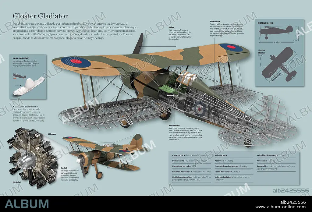 Descripción: Infografía del Gloster Gladiator, el último caza biplano utilizado por la fuerza aérea británica y el primero armado con cuatro ametralladoras fijas.