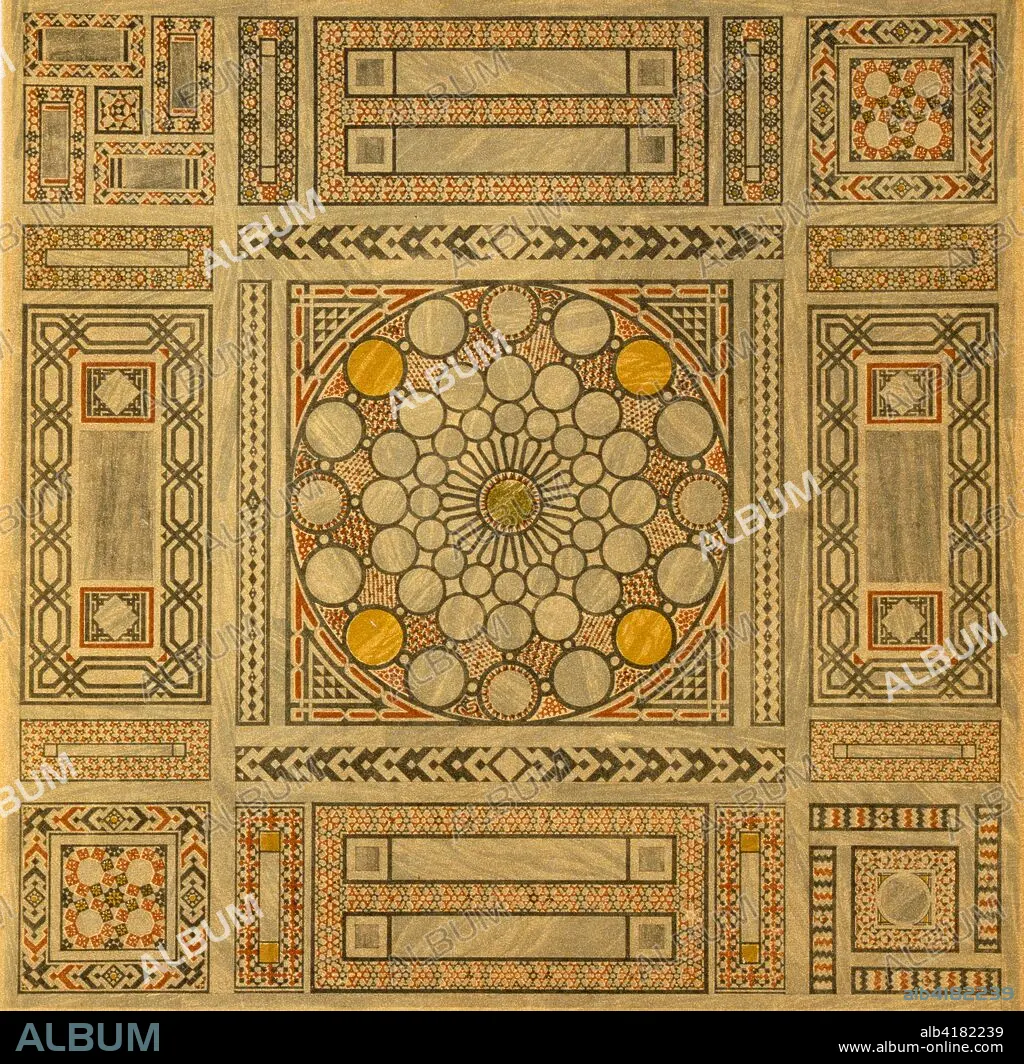 Mosaic decoration from the Mosque of Al-Ma'ini in Damietta, from The Mosques of Egypt from 21 to 1365 H; pub. 1949 (colour lithographgraph). Highly ornate geometric mosaic decoration, possibly of a marble floor; from the Mosque of Al-Ma'ini in Damietta, also known as Damiata, or Domyat; a port in North Egypt; from: The Mosques of Egypt from 21H to 1365H (ie 641AD to 1946AD), by Cresswell K.A.C. (1879-1974).
