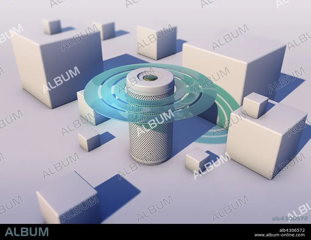 Abstract smart speaker emitting sound waves.