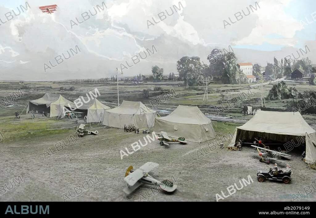 PRIMERA GUERRA MUNDIAL. AVIACION. Diorama que muestra un campo de aviación operacional de la I GM, típico entre 1917/1918. Se compone de una colección de tiendas de campaña y aviones pintados individualmente. Un biplano de caza alemán Albatros D. V. y un triplano de caza alemmán Kokker Dr. I. Deutsches Museum (Museo de la Ciencia y la Tecnología). Munich. Alemania. Europa.
